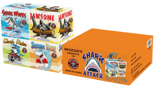 Shark Waves with Unique strobing mines with crackling willow and vivid colors. Jawsome with Awesome Nishiki willows with neon stars. Shark Rider with Breathtaking Multi-color stars with white strobe and green strobe. Shark Tale with green, red and gold peek-a-boo cake! Let's have fun.